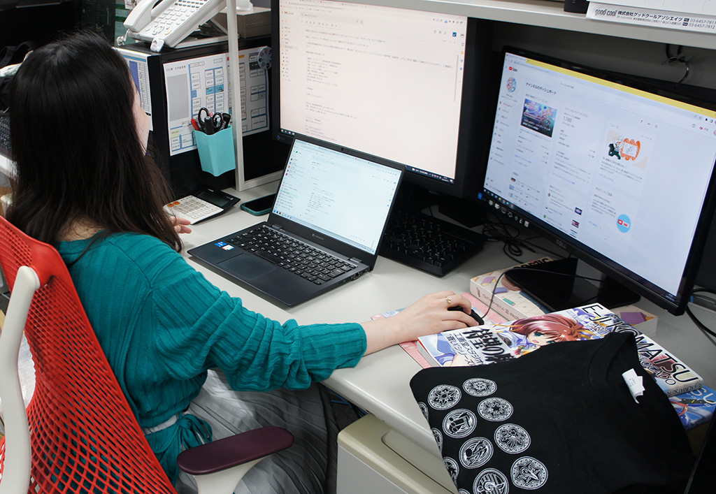 自社ゲームや他社ライセンスのグッズ企画、ゲーム・グッズの広報、ゲームのプロジェクト企画・進行管理、と多岐にわたって担当しています。